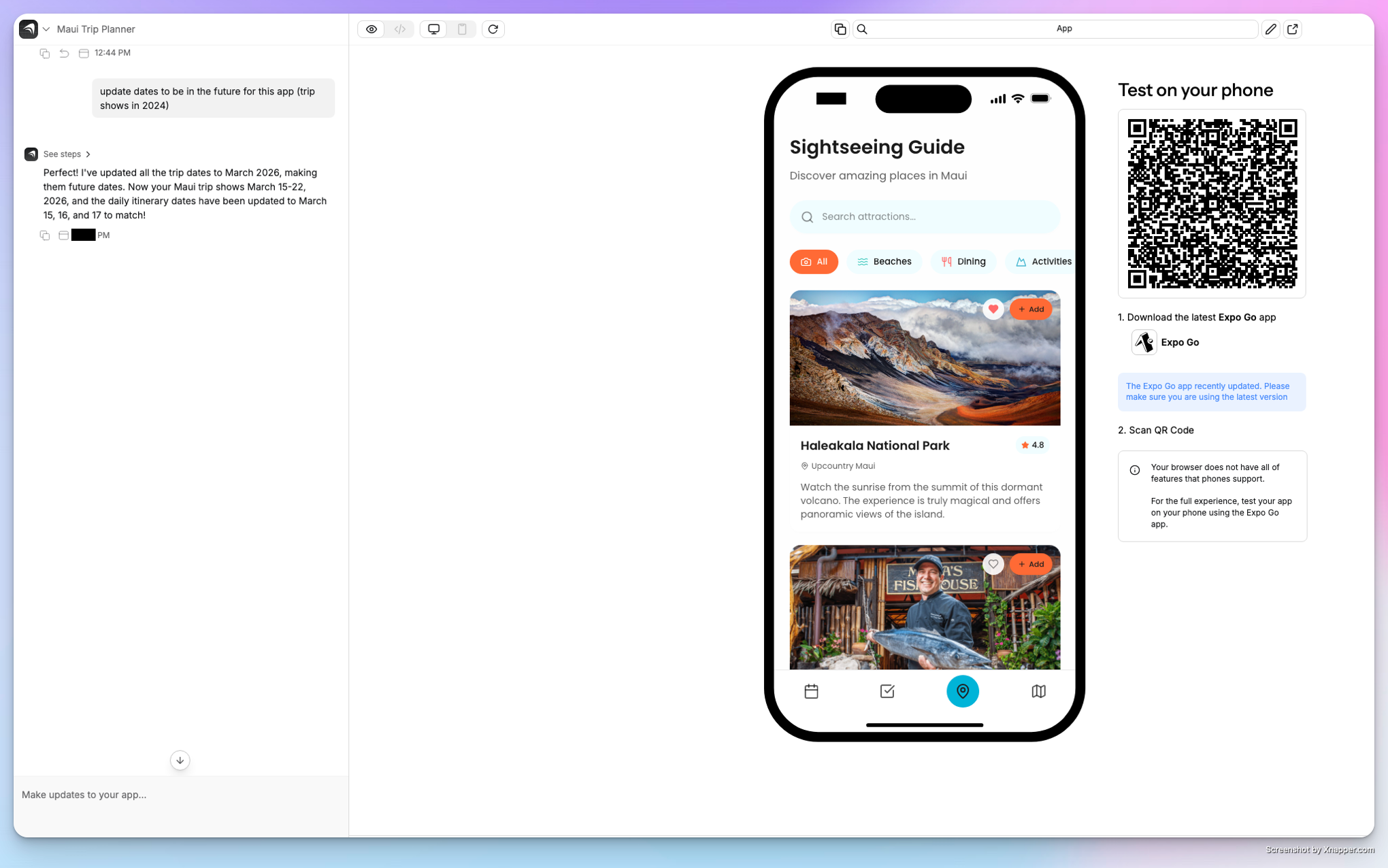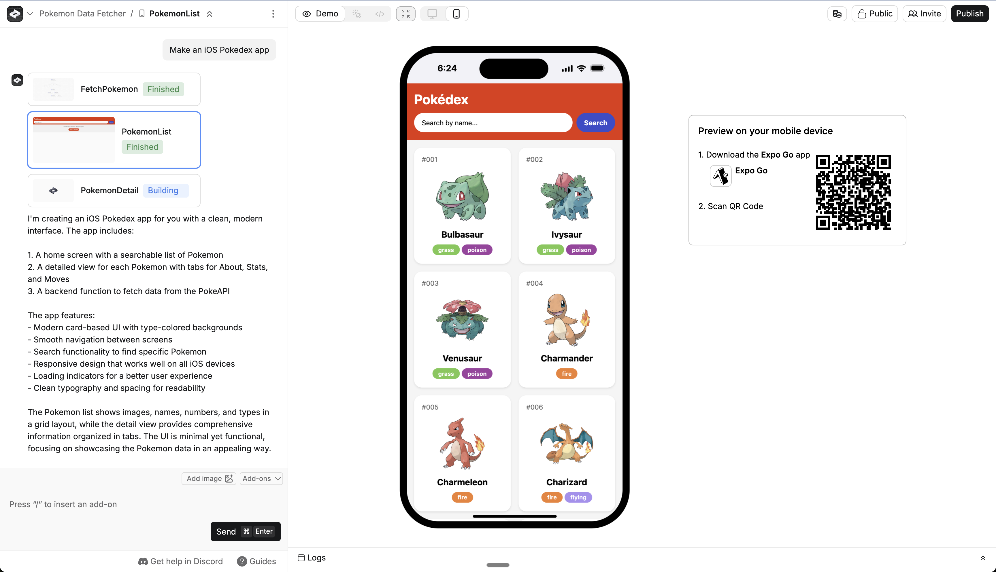 Create’s web builder shows you a preview of your app as you chat. But to test the full experience, you’ll want to preview on your device. Some of your app features that require device capabilities will only work in Preview.1
